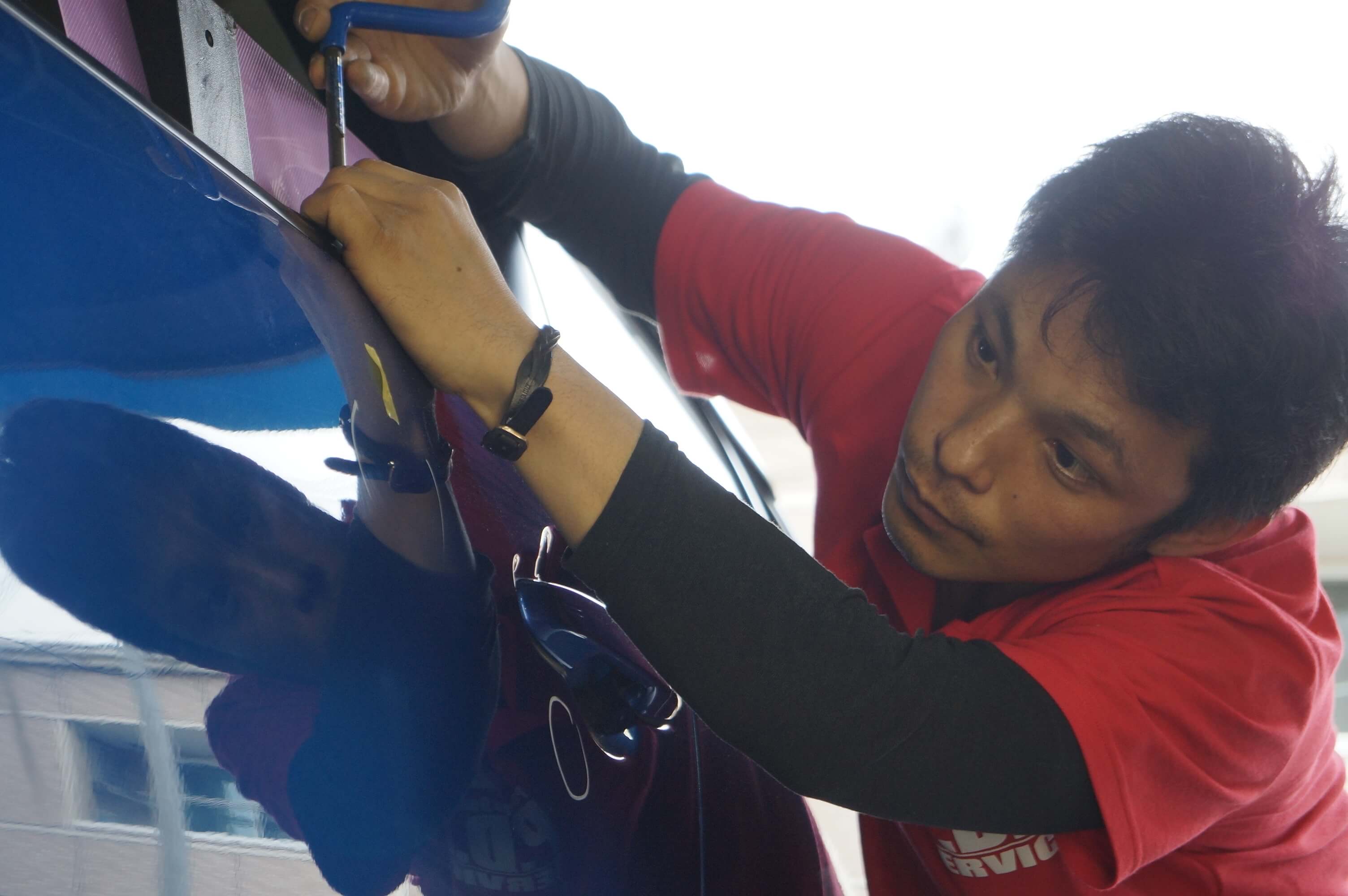 デントリペアは数十本の特殊専用ツールを使い分け、車のボディにできた凹みの裏側からゆっくり丁寧に押し上げることで、塗装することなく短時間で安価に、とても綺麗に仕上げることができます。 その仕上がりは査定士が見ても発見することが出来ない程で、近年自動車業界でなくてはならない存在になり始めております。