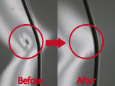 近年になってアメリカから上陸した最新の自動車特殊板金技術を「デントリペア」と言います。デントリペアとは、車に出来た小さな凹みを復元する画期的修復法です。 正式名称をペイントレス・デントリペアと言い、その名の通り従来の板金や再塗装をすることなく数十分程度で修復してしまう技術を呼びます。 凹みを裏側から専用特殊工具で丁寧に押し戻すことにより、歪みまでコンロトールしとても早く綺麗に直せるのが特徴です。塗装しないで修復することにより、とても早く綺麗に、そしてお安くご提供することが出来ます。