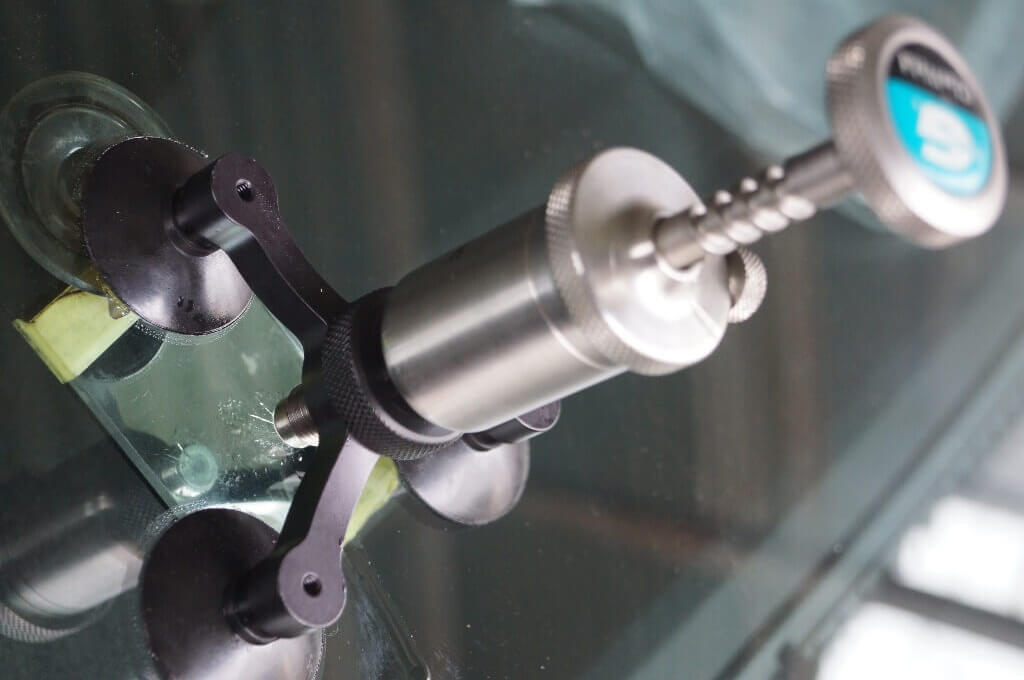 フロントガラスにできた飛び石などによるヒビ割れを専用の器具で丁寧に修理していきます。